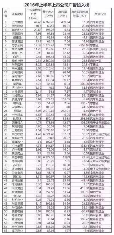 (圖片來源:東方財富網(wǎng)) 而與此形成印證的另一組數(shù)據(jù)來自2016年9月,億邦動力網(wǎng)發(fā)布的“2016年上半年上市公司廣告投入榜”上,排名前二十的公司中,醫(yī)藥制造企業(yè)竟占了“半壁江山”。